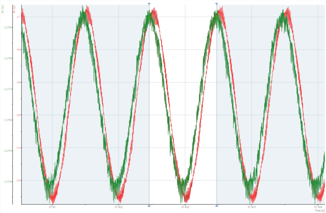 EIS是一种通过向电化学系统施加微幅正弦电压/电流扰动信号,测量其在不同频率(通常10μHz-1MHz)下的电流/电压响应,特别是相位差及幅值比,进而计算复阻抗随频率变化的谱图的技术。其核心在于利用小扰动满足线性响应条件,使系统行为可用频域传递函数表征。EIS计算依赖于采集的电流以及电压数据。比如,对一个锂电池系统,在20A直流运行过程中施加频率10000Hz~0.1Hz,幅值为2A(RMS)的交流电流扰动,过程中采集的电流电压信号如下: