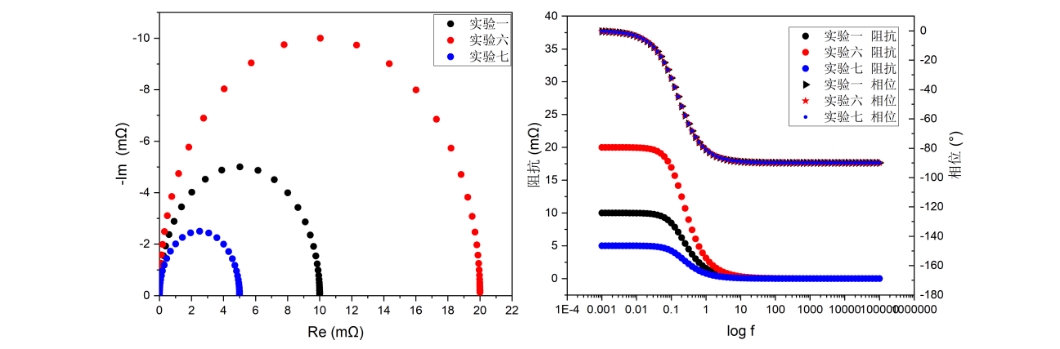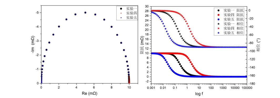实验一、二、三研究电阻变化对结果的影响,结果如下图所示。左边图形表明,电容和频率相同时候,电阻越大,阻抗模值更大,并且相位差更加靠近电容的区域,这些从基本表达式就可以了解到。