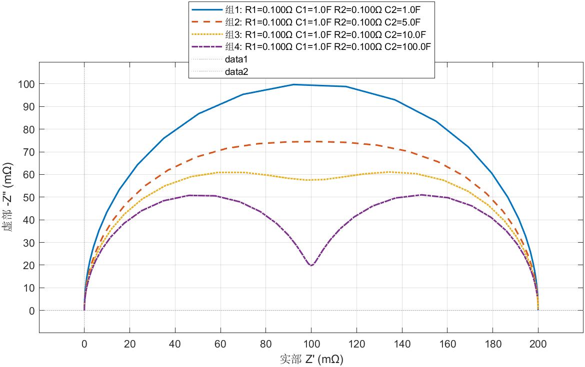 从图中可以看出,时间常数相差十倍只是一个建议值,具体与RC的具体参数有关。当电阻相差不大时,电容即使相差不大,也比较容易区分出双弧结构,但是当电阻差别大的时候,双弧结构就变得不是很明显。